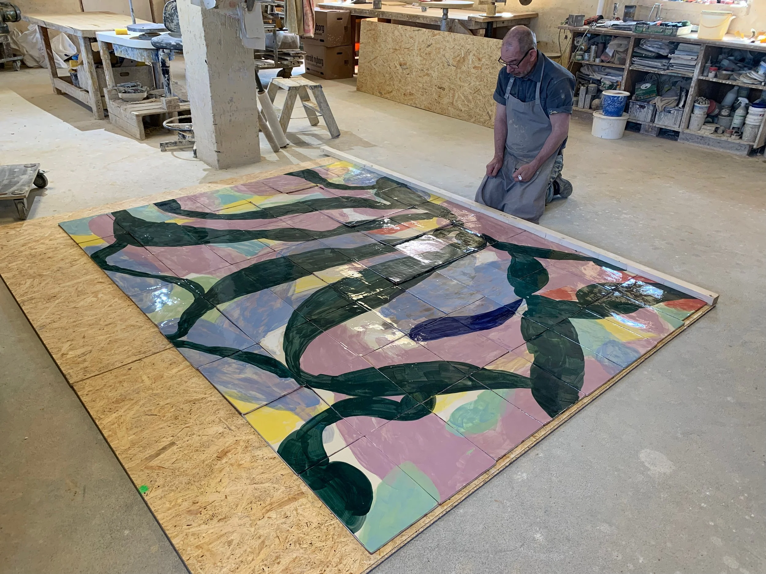 Fliserne er blevet til i forbindelse med at jeg udført 2 store keramiske malerier til LYSHOLT, som er en helt ny institution i Ikast-Brande Kommune, der åbner sidst i august 2023. Malerierne, hver ca. 2 x 3 meter, består af lertøjsfliser der er muret op på væggene i hver af de 2 større overdækkede terrasser i bygningen, som et todelt værk udformet stedsspecifikt til huset og, i bogstavelig forstand, integreret i bygningen i Ikast.