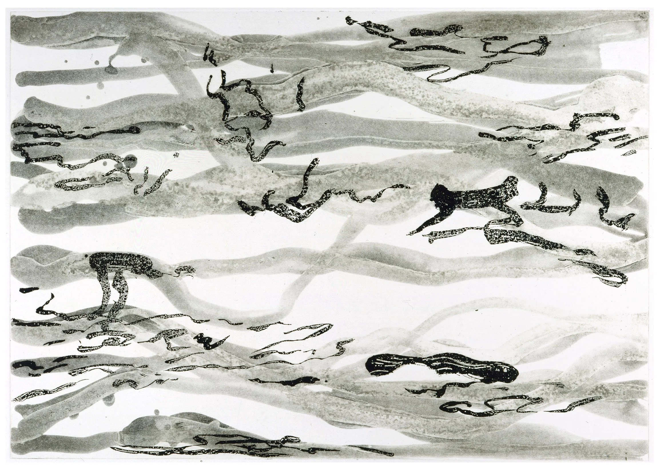 There is a space expanded between signs and coincidence, the closed form and suggested meaning. In the graphic works the interaction of different techniques: aquatint, drypoint and sugarlift create a three-dimensional effect of multiple surfaces, even though none can be touched or felt. Across the diffuse, plain surface a row of signs have settled, like birds in migration.